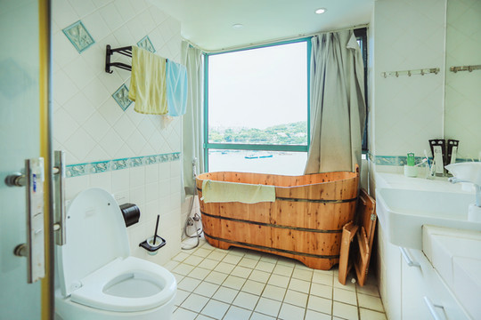 民宿一共有两个卫生间,一个是在主卧的房间内,一个是公用的。主卫的风景非常赞,还有一个泡澡桶。