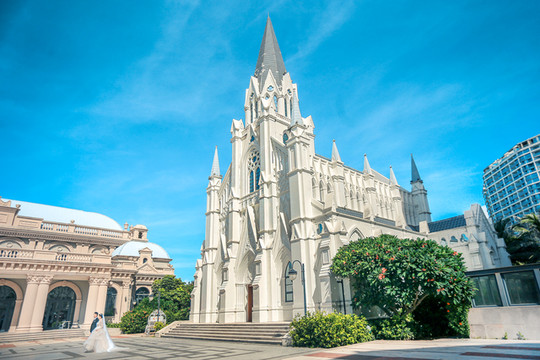 坐落在吉庆广场上的白色教堂,应该是这里最精华的一幢建筑了,教堂的门口总是有络绎不绝的新人来此拍摄婚纱照。