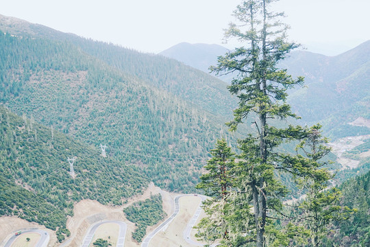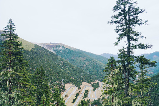 遇上阴天的天路十八弯,放眼远眺,云雾缭绕,苍翠的云杉下就是天路十八弯,别有一番意境。