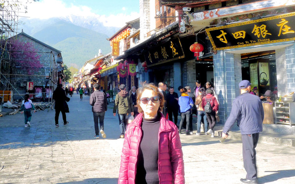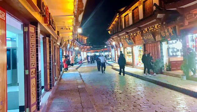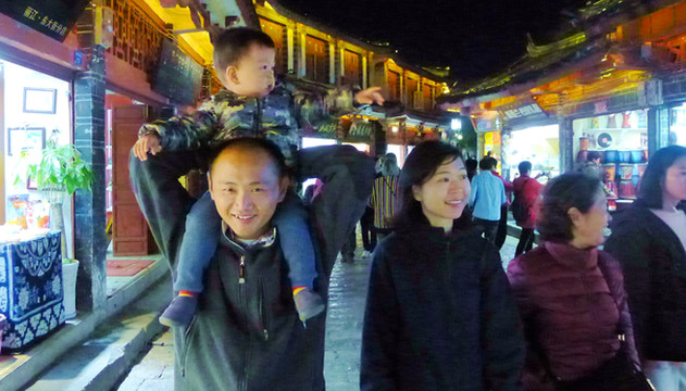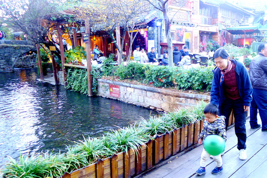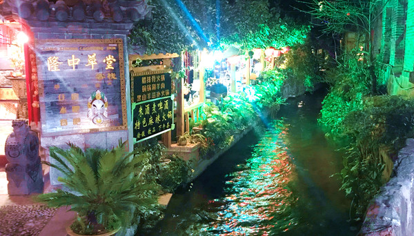 再上国道G214,15:52过“松园桥”进入丽江辖区,16:12经“白汉场”上大丽高速,16:32在“丽江西”下高速进入丽江市区,直接驶往丽江古城。在古城外面寻找停车位花费了不少时间,走进城内已是华灯初上。相比我与宝爸1999年前来这里所留下的记忆,现时的古城已经是变化颇多,当年是感觉到处小桥、流水,沿河街道窄窄的,房屋也都矮小、破旧,现今则是旧貌换新颜,街道明显加宽,店铺也都是新房。