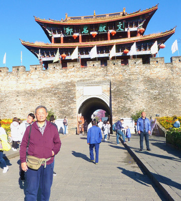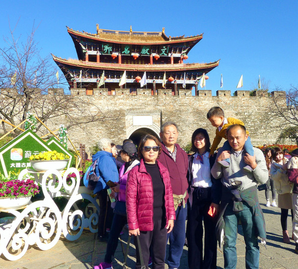 10:20抵达古城南门,城楼又名承恩楼,始建于明初洪武年间,但古时的建筑早已不存,现有城楼为上世纪80年代年重修。南城门被公认为是大理古城四座城门之首,也是拍摄“大理到此一游”的首选,我们也架设起三脚架,自拍了一张全家福。