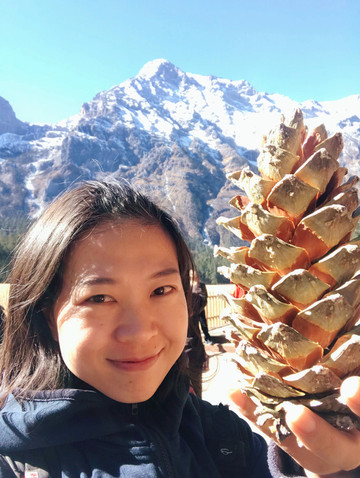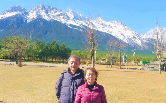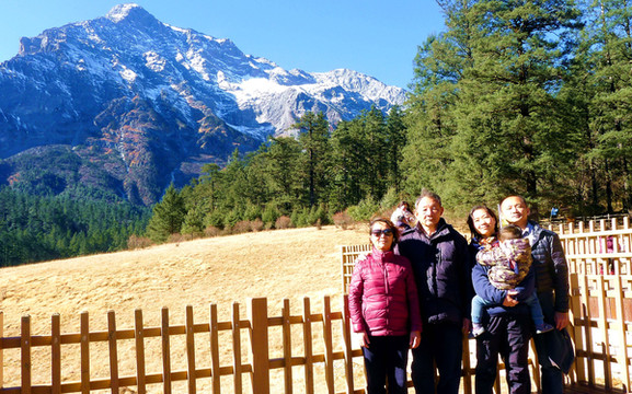 云杉坪隐藏在深山之中,四周全是高大的云杉,缆车只行驶约5分钟便抵达“上站”,下缆车后在密林中徒步800多米,视野豁然开朗,眼前出现了雪山、草坪,这便就是“云杉坪”。云杉坪曾为纳西族青年男女逃亡徇情的圣地,纳西语称“游午阁”,意即“情死之地”。我和宝爸1999年曾来过这里,当时正值阴雨,云雾满山看不见雪山,今日则是碧空如洗,雪山可以看得非常清楚,我们也自拍了一张雪山草坪上的全家福合影。云杉树高大其果实也大,宝妈拾到一个大大的杉果,很是得意,还把它带回了厦门。