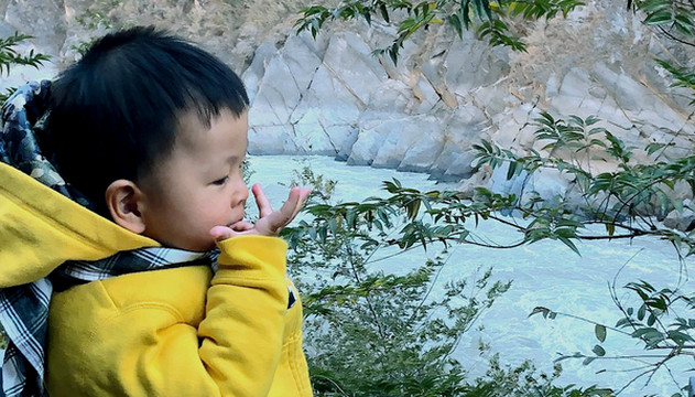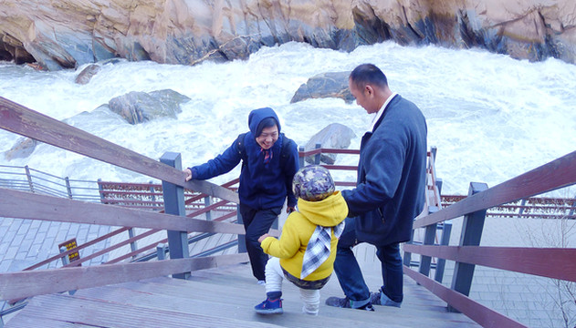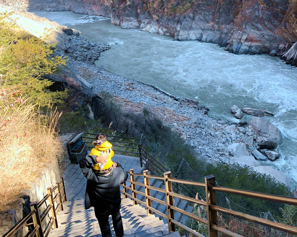 13:30下行到阶梯最底部,沿江多处都修建了观景平台,这些都是1999年不曾有的,当年的江边就只有一条狭窄小路。宝宝显得极其兴奋,不听大人招呼在观景台上乱跑,对于他这么小的身躯观景台护栏就显得不够严密,宝爸赶忙抓他过来再“骑大马”,但宝宝却是并不领情,嚎啕大哭。
