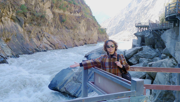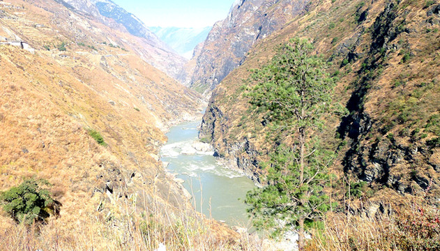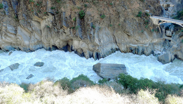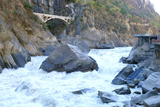 虎跳峡位于香格里拉市的虎跳峡镇,千里奔波而来的金沙江流经此处突遭玉龙、哈巴两座大山夹峙,江面骤然收缩,原本平静的江水顿时变得雪浪翻飞,就好像是一条被激怒的白龙在峡谷内狂奔,更有一块13米高的巨石雄踞江心,将浩荡江水一分为二,激流与巨石搏击,引发山轰谷鸣好似万马奔腾,撼人肺腑。当地传言曾有老虎经此江心巨石跳过金沙江,故而石称“虎跳石”,峡谷得名“虎跳峡”。