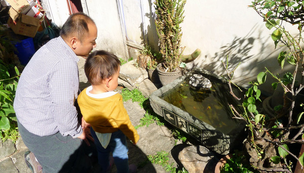 博爱路也是南北走向,位于西侧与复兴路并排,人行道上的樱花很是漂亮。这条街不如复兴路热闹,街上店铺大多经营生活用品,猜想主要是为古城常住居民服务。大理古城除东、西、南、北四座有城楼的城门外,其实还有多座没有顶楼的城门,博爱门便是其中之一,它与南城门并排,也是坐北朝南。午餐特意挑选一家庭院式的白族餐馆,品尝白族风味,但宝宝却是更加在意人家庭院鱼缸里的小鱼。