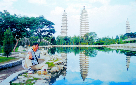 塔区右前方有“聚影池”,1997年修建,它是拍摄三塔倒影的最佳地点。1999年宝爸曾在池边留影,当时无风,水平如镜,拍摄出的倒影甚至要比三塔实景更加漂亮。此刻故地重游,宝爸又在池边拍照,当年独自一人,现在是一家三口。然而,美中不足是今日刮大风,水面上满是皱褶,没拍出什么倒影。