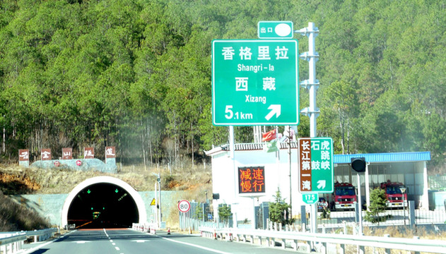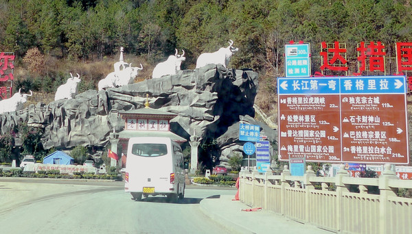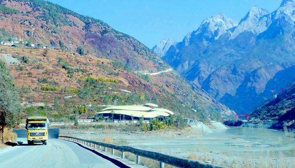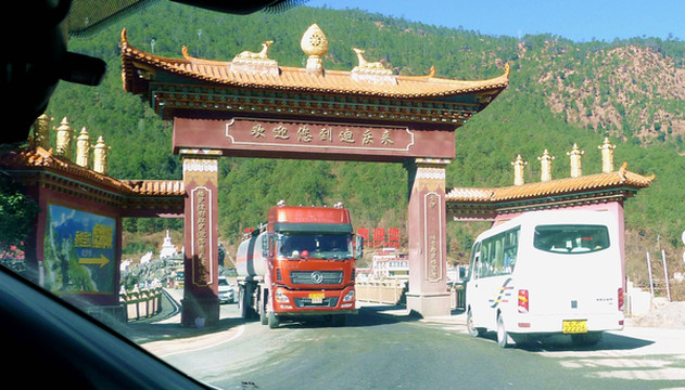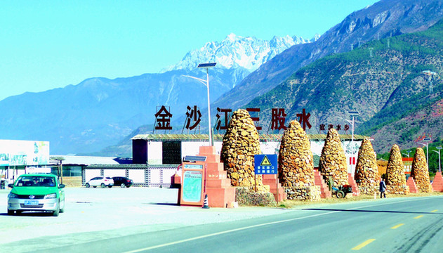 “松园桥”是丽江与迪庆的界桥,桥东属于丽江,桥西是迪庆藏族自治州的香格里拉县。驱车过桥到西岸,继续沿国道G214北行,12:33看到前方横亘一条小河,它是金沙江的支流硕多岗河,发源于香格里拉县的楚力措,在虎跳峡的峡口附近汇入金沙江,当地人称“冲江河”,因为它是在这里“冲”入金沙江。两河交汇口旁有一建筑好似“龟壳”,它就是虎跳峡景区的游客服务中心。