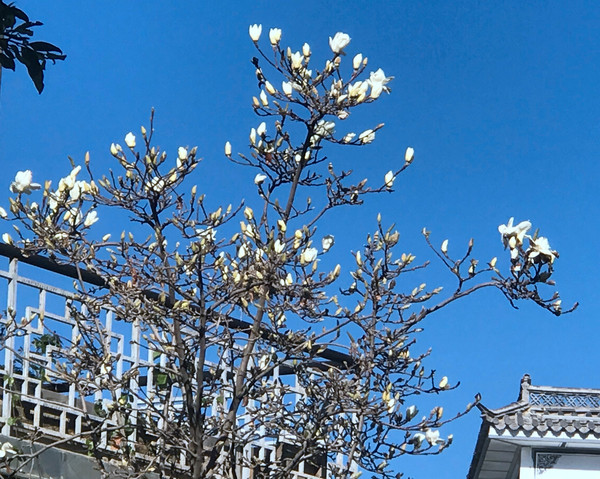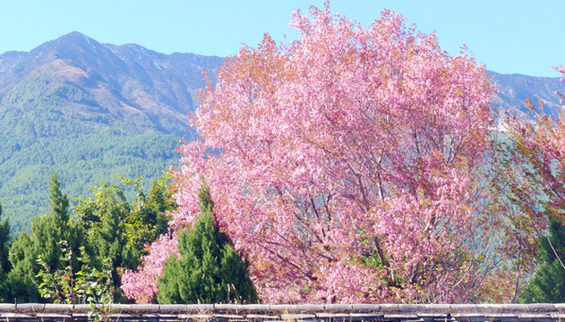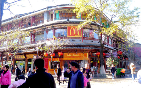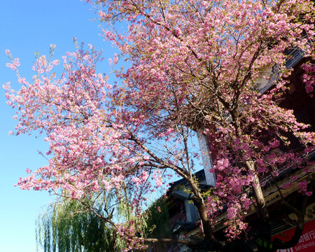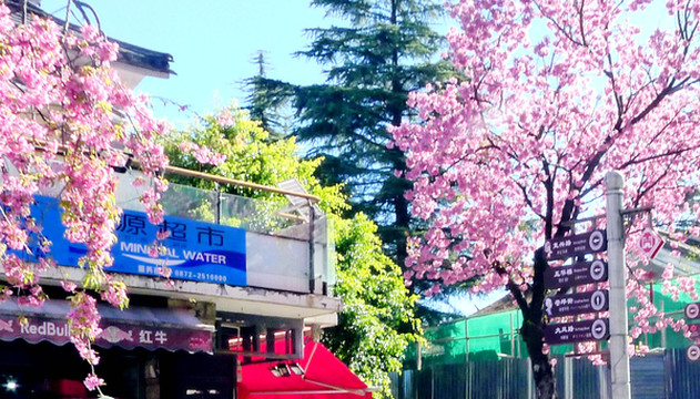 继续北行,11:06走到(人民路/复兴路)路口,这里有家麦当劳,再向前还有肯德基,它们都是近年新开,我2006年来时还没有这类洋快餐店铺。此地路口有株开花大树,据说是樱花,以往只知樱花是日本国花,来到大理才知道原来樱花的真正故乡是中国,日本樱花也是唐朝年间从我国引种。眼前的这株樱花是大理本地品种,叫做“冬樱花”,每年12月花期最盛。