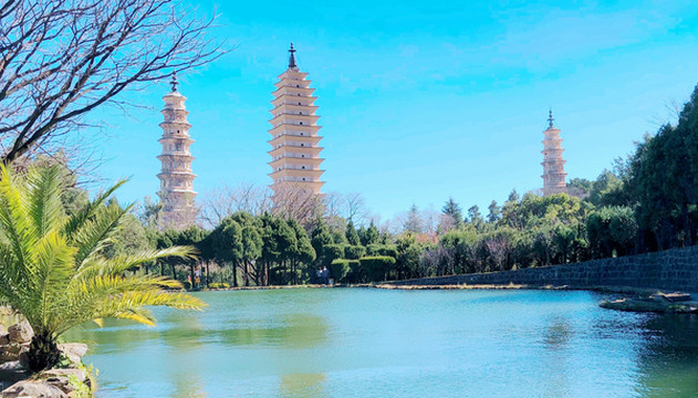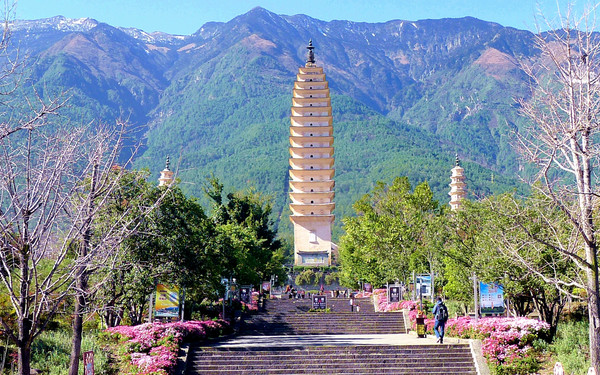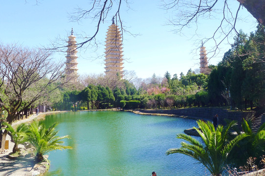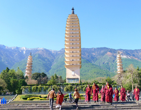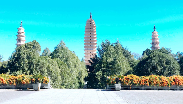 进入庙门,迎面就是雄伟的三塔,一大两小,三塔鼎立。三塔之主塔称“千寻塔”,为南诏国时期(唐代)修建,外观为方形、16层、密檐式,塔门前矗立明代增建的巨石照壁“永镇山川”。此塔具有明显的唐塔的风韵,造型与西安大、小雁塔颇为神似。两座小塔几乎一模一样,从南、北两侧拱卫着主塔,它们都是大理国时期(宋代)建造,均为八角、十级、密檐式的空心砖塔,外观也有明显的宋塔风格。
