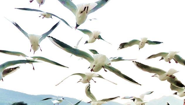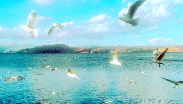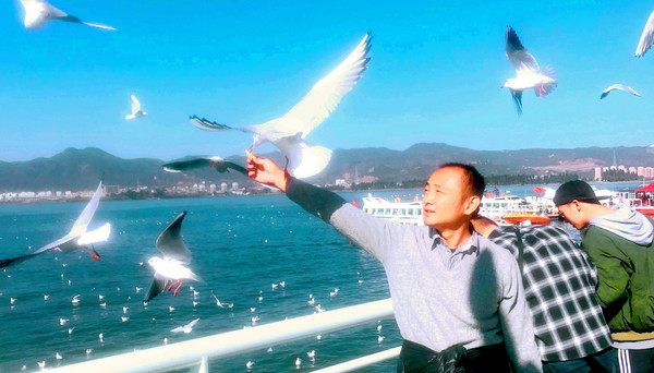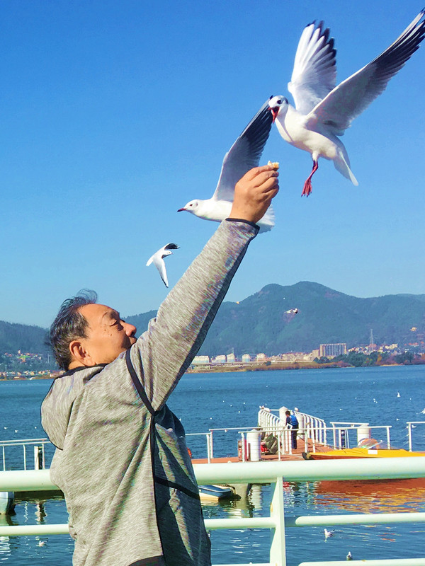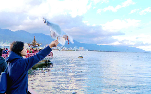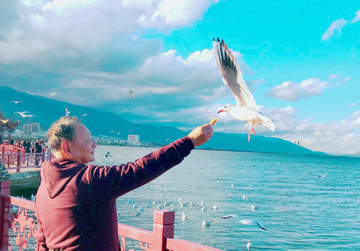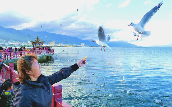 洱海红嘴鸥也是一道亮丽风景线,它们与昆明的红嘴鸥一样,也是每年晚秋从西伯利亚飞来,在美丽洱海过冬,来年初春又飞返遥远的北方。大理位置偏西,天黑较晚,虽然此刻也是17:30左右,但洱海的红嘴鸥却是依然活跃,我们刚把手中的面包举起,它们就一只接一只地飞过来争抢,有时是整大块的面包都被它们抢走。