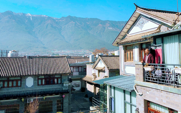2018.12.20(D9),“拾花舍”提供早餐,米粥、蒸饺、水果,吃罢又到客栈附近转转。“拾花舍”东、北、西三面都是连片的新房,其中很多为宾馆、客栈,只有南侧还存留大片荒地,但据说都已被老板购买,今后还要继续开发。从这这个位置向西,可以看见山顶积雪的苍山。大理亦有“风花雪月”之说,人称“下关风、上关花、苍山雪、洱海月”,我们昨日领教了“下关风”,今天又看到“苍山雪”。