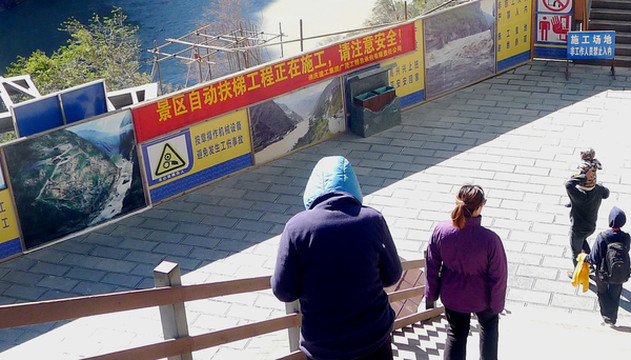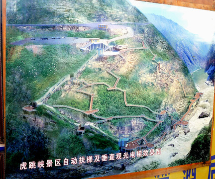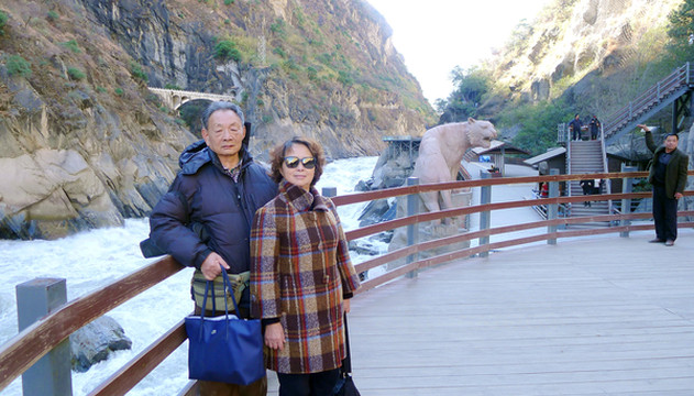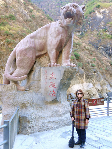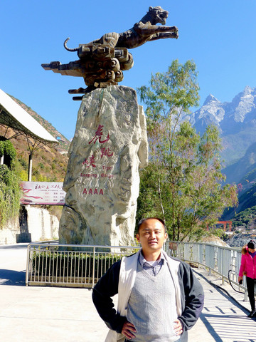 12:36驶抵游客中心,这里有座老虎腾飞雕塑,抬头仰望是巍峨的玉龙雪山,还有正在修建中的香(格里拉)-丽(江)高速公路金沙江大桥。购票后继续前行,12:58驶抵景区停车场,“虎跳峡”就在停车场的正下方。1999年的停车场远没现在这么宽阔,从停车场往下走到江边也是仅有陡峭的石阶,现今则是大为改善,不单是已经有了钢架楼梯,上下行走方便、安全多了,而且,自动扶梯也已经在施工建造,今后的游览会更加方便。