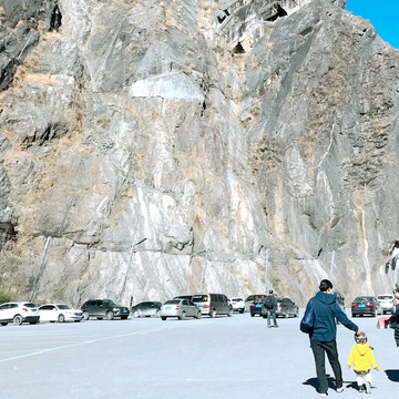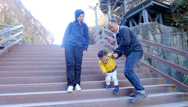 钢架楼梯结实、宽阔,一路下行毫不费力,宝宝最初还是“骑大马”,但骑行一段路后也来了兴趣,执意要求下地自己走。峡谷深邃阳光难以直射,冬季的寒风又是颇为凌冽,大家都觉得有些寒意,这也为我们随后的行程变故埋下了伏笔。