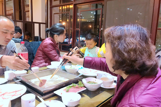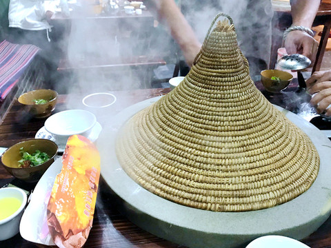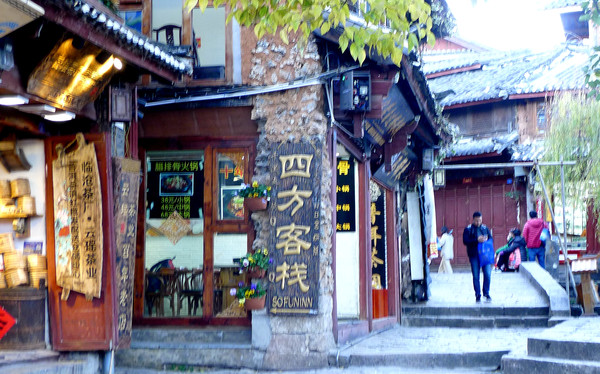 17:35抵达丽江市的束河古镇,入住“爱锦荣精品客栈”。这家客栈的整体环境不错,特别是顶层阳台能够眺望玉龙雪山,只是没有暖风空调,地热供暖也不给力。稍事安顿后前往丽江古城观赏夜景,晚餐就在古城旁边品尝“蒸汽石锅鱼”,小店的老板来自泸沽湖,是一对摩梭小夫妻,“石锅”就是将整块的天然石料雕琢、打磨成为锅状,底部设置阀门,老板先用蒸汽清洗石锅,然后再将鱼片、配料、清水放入锅中,盖上草帽从锅底通入蒸汽,一阵巨大响声过后(大约3~5分钟),汤汁乳白、味道浓醇的鱼汤就可以吃了。
