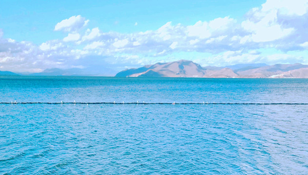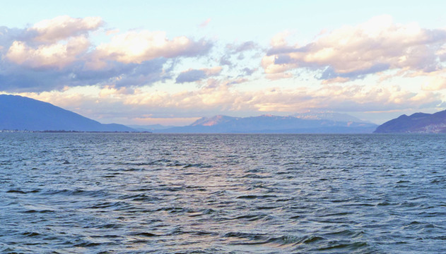 海心亭旁设置游船码头,此刻是旅游淡季,我们购票上船后坐等了很久都不见再有人登船,一艘能容30~40人的游艇最终变成是我们这一家人的包船。岸边逗留时并不觉得风大,但驶入洱海深处就遇风大浪涌,站立拍照都感觉有些脚下不稳,海拔2000米的高原上能有这么一大片水面也算实属难得。从船上眺望洱海西岸,突见“苍山”上空出现了壮丽的云景,苍洱地域素有“望夫云”之说,传言每当它在苍山上空出现,洱海水面就会起风,不知此刻所见是否就是“望夫云”。