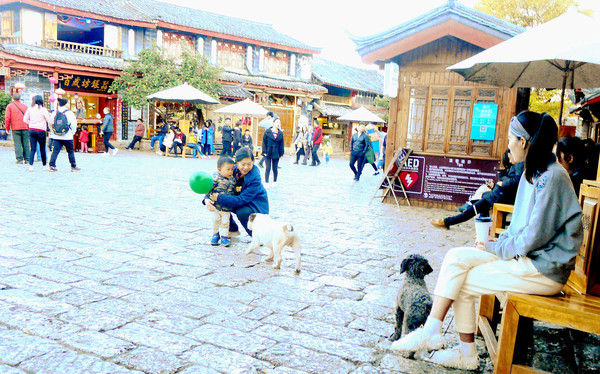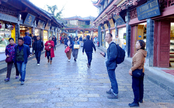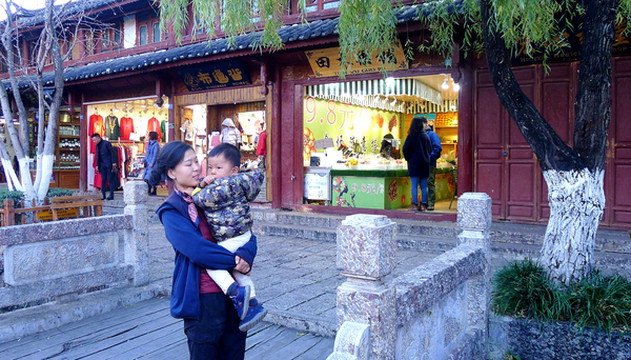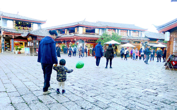1999年来古城,有两个地方让我印象最深,“四方街”与“大石桥”,这次也都前往转转。丽江古城实际上应称为“大研古城”,始建于南宋,距今已有800多年。“四方街”广场是古城的中心,条条石板路自城中不同方向聚汇到此处,自打遥远年代直至民国时期,这里都是滇藏茶马古道上各路马帮的聚首交易场所。1999年我来古城,这里也曾是最吸引游客的“商业中心”,广场上排满售卖土特产和各种手工艺品的摊位,穿着民族服装的小贩大声吆喝、招揽顾客。当年我们也曾在四方街旁的一家小店用晚餐,二层小楼全为木构,古旧残破,上楼时感觉楼梯和地板都会颤动。现时的广场面积明显增大,周边房屋全都是新的,猜想应该也都是钢筋水泥框架,相比以往肯定是要牢靠多了。
