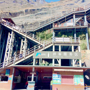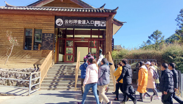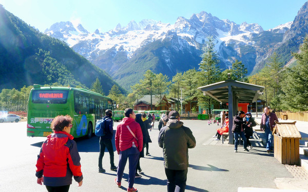 不同线路的交通车有不同发车点,前往云杉坪是要在蓝月谷发车点上车。这里附设餐饮中心,提供各类中、西式快餐,我们决定先吃午饭,选择“过桥米线”,这是云南特色,感觉味道颇佳。饭后乘车,先经“蓝月谷”,13:47驶抵云杉坪索道“下站”,旅游淡季游人不多,基本上无需排队。