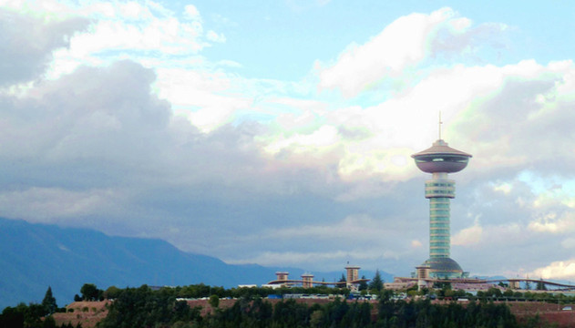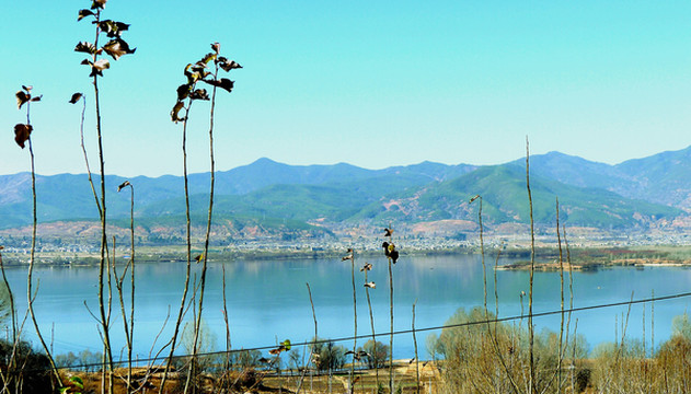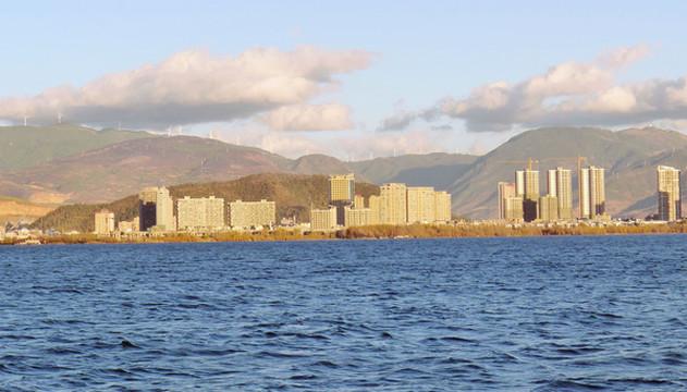 16:32离开杭瑞高速,右拐,进入G5611大丽高速向北,继而又在大理东(云浪)收费站下高速,进入大理市区(下关镇)。16:42路过一座高塔,本以为是大理机场塔台,后来才知是“龙山公园”的旅游设施。17:00抵达“洱海”南岸的“滨海大道”,从这里北眺洱海最显辽阔。