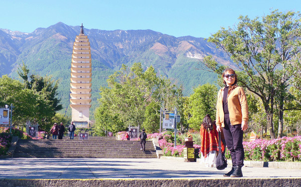 照片拍罢前往钟楼,路遇樱花盛开,宝宝也是勃勃英姿,迎着大风“骑大马”。现有之崇圣寺钟楼是1997年复建,内有巨钟,也是1997年参照历史文献描述的崇圣寺古代大钟重铸。崇圣寺原有大钟是南诏国建极年间铸造,称“南诏建极大钟”,时间相当于唐代。另有明朝文献记载,明朝年间的崇圣寺内尚有五大重器:三塔、鸿钟、雨铜观音像、三圣金像与“佛都”匾。其中的“鸿钟”即为“南诏建极大钟”。然而,后世因为种种原因,五大重器唯有三塔保留至今,其他四件皆已不存。钟楼位于三塔背后,站在楼前的平台上回望,三塔的高度似乎差别不大,这是距离造成的错觉,三塔呈“品”字形排布,主塔较远,小塔较近。