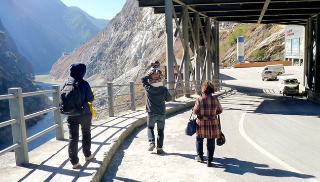 停车场的尽头有一隧道,公路穿过隧道通往中、下虎跳,我们决定去探个究竟。然而,车至隧道口却看到景区“提醒”,通报隧道的另一端不属景区范围,路况不佳,建议谨慎前往,后果自负。大家商议后决定还是继续向前,发现不对劲就立即折返。于是,我们驱车穿越隧道,两端所见果然是大相径庭,景区一侧是平整的公路、宽阔的停车场,另一侧不仅公路狭窄、破损、坑坑洼洼,而且,行驶约10多分钟后发现道路中央竟然有长长的纵向裂缝,而且,沿江的半边路面已经明显向金沙江的方向沉降。宝爸不敢再往前开,我们还没驶出“上虎跳”的地域就掉头折返,直接回丽江。