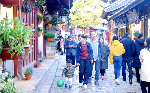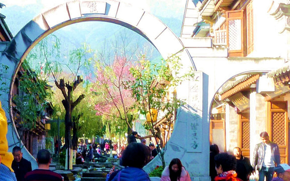 南城门内的复兴路是大理古城主干道,也是古城最繁华的街区,我们沿着复兴路北行,先是来到“红龙井”路口。红龙井是条老街,自古沿街多井,还有一条来自苍山的清澈溪水沿着古街流淌,住户家家养花,街上还有玉白菜、十二生肖、叠水台、石拱桥等人工小景,被公认为是古城内仅次于洋人街的第二道靓丽风景线。我2006年就是住在这条小街附近,每日进出都能看到“清泉石上流,处处有花开”的美景。今日再来,因为同行众人都是急着要去洋人街,只在街口拍了张照片,然后就继续前行。
