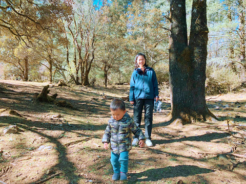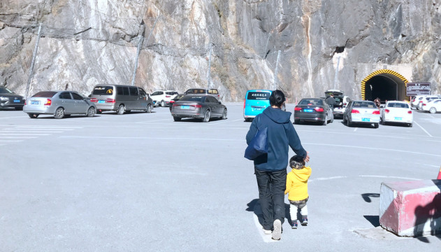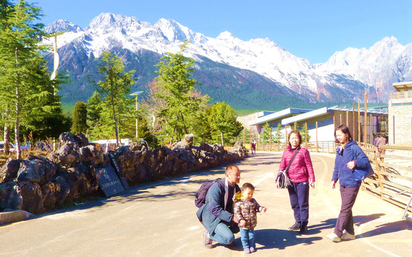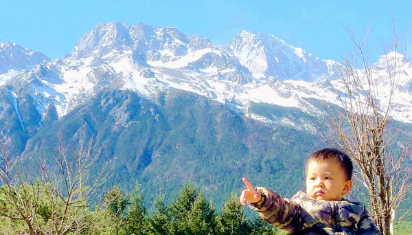 10:30出发前往玉龙雪山,它是整个北半球地理位置最为靠南的雪山,主峰“扇子陡”海拔5596米,山顶终年积雪。11:35抵达“玉龙雪山旅游服务中心”,外来车辆都必须在这里停放,游客换乘景区交通车进山。服务中心有不同线路的交通车,可以将游客送往景区内不同景点、不同索道。此地是位于玉龙雪山主峰脚下,景色也是颇佳,我们停放好汽车就先在这里逛逛、拍拍照片。宝宝指点江山,慷慨激昂。