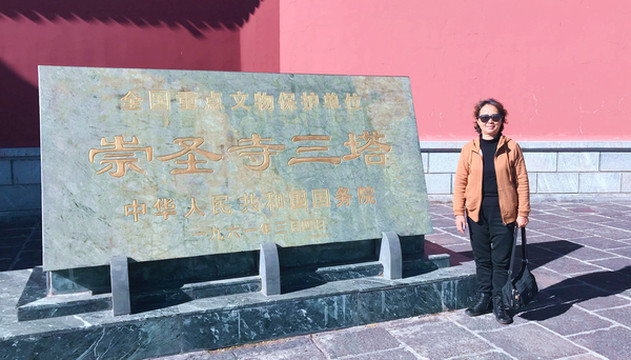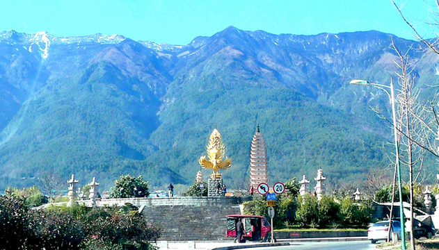崇圣寺距离“易方精品酒店”不远,我们11:10退房、出发,先沿酒店旁边的“大丽线”向北行驶约800米,然后左拐,进入全长约1.4公里的“崇圣路”,再直行走到底就是崇圣寺的正门,门前有座圆形小广场,它就是“金翅鸟广场”,正中金光灿灿的大鹏金翅鸟塑像是按照大理国时期的文物放大、复制而成。寺庙门前有块石碑,表明“崇圣寺三塔”是国务院重点文物保护单位。