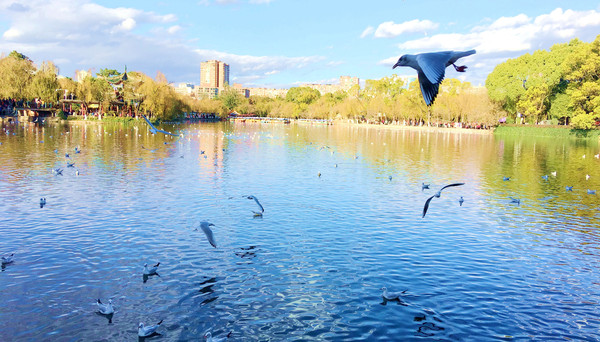 昆明观“鸭”主要就是“翠湖公园”与“海埂大坝”,酒店距离翠湖较近,稍事安顿后即刻前往。驱车抵达翠湖,寻找停车位又浪费了一些时间,匆匆赶抵湖畔已是16:55。此刻的红嘴鸥似乎都已被游人喂饱,密密麻麻停留在湖面上歇息,只有少量还在天空飞翔。我们买了些“鸥粮”放在手掌中高举,但它们却都不愿理睬,只有将大把的“鸥粮”抛向空中,它们才会飞过来争食。17:30左右,仿佛是有统一的号令,红嘴鸥开始一批接一批地起飞,绕湖盘旋,待上升到足够高度就都朝着同一方向飞走,据说是要去滇池过夜。喧闹的翠湖突然就变得十分安静,湖面上竟然一只鸥鸟不剩,游人也都纷纷散去。