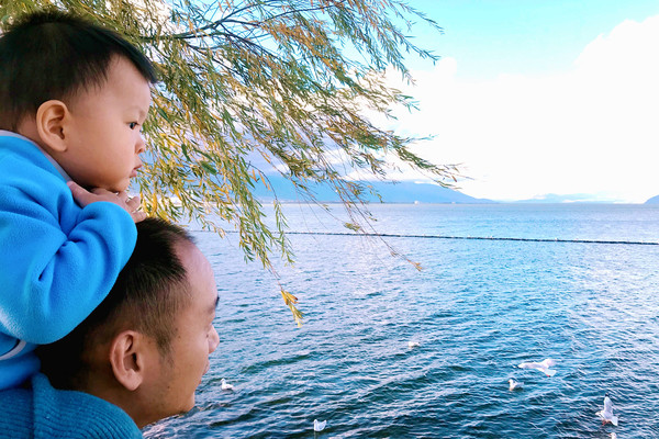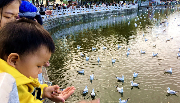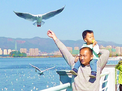 2018.12.26(D15),返厦航班MU5781是16:25起飞,今日的时间也是比较宽裕,上午酒店退房后先赴滇池海埂大坝观赏红嘴鸥,也就是宝宝念念不忘的“鸭鸭”。早餐特意暗藏了些油条,因为根据前面两次喂食红嘴鸥的经验,我们发现使用油条最为合适,这一方面是因为鸥鸟比较爱吃,另一方面也是因为油条比较结实、经喂,鸟儿只能一口一口地啄食,不像面包那样轻易就被撕走一大块。滇池红嘴鸥也是每天有两次觅食高峰,9:00-11:00与14:00-17:00,在此期间它们都很活跃,积极与游人互动,11:00-13:00停留在水面休息,算是午休。我们今日晨起较晚,行动又较拖拉,抵达海埂大坝已是10:40左右,初到时刻还见鸥鸟铺天盖地,场面极其壮观,然而,待到我们12:08撤离时,大部分的鸟儿都已经不再飞了。宝宝突发兴致也要喂“鸭”,宝爸递给他一块蛋糕,但他却是将蛋糕塞进自己嘴里。