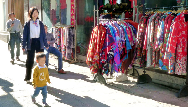 10:00左右“拾花舍”退房,驱车前往大理古城,宝宝也赶忙带上他的小白兔。以往我曾两访大理古城:第一次是1999年,自驾赴中甸(现称香格里拉)途径大理,主要是探访了三塔与蝴蝶泉,古城仅为过路转了一下,没啥特别印象;第二次是2006年,在城内住了四天,将整座大理古城都走了个“透透”。大理古城为四方形,四座城楼分别为南城门、北城门、洱海门(东门)、苍山门(西门),其中:南、北城门是两两对峙,分别位于“复兴路”的南、北两端;东门(洱海门)与西门(苍山门)则是错开一个角度,洱海门位于“人民路”的东端,苍山门位于“玉洱路”的西端。人民路与玉洱路之间还挟持着一条东西走向的“护国路”,因为街上店铺、餐厅颇受老外钟情,俗称“洋人街”。2006年我曾看到这条街上有些西餐馆的老板本身就是老外,我也曾问过一位澳大利亚游客,他称赞这里的西餐很是正宗。