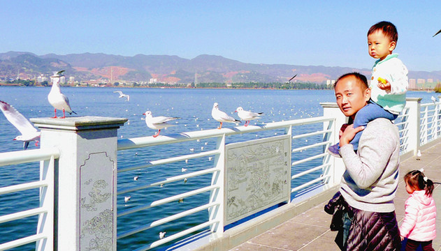 因为返厦时刻还要再来昆明(搭机),此番就不拟在昆久停,准备明早赴大理,今天的唯一安排就是要带宝宝去看“鸭鸭”。“鸭鸭”就是红嘴鸥,每年冬季都会从西伯利亚飞来昆明越冬,宝宝将所有会在水面游泳的鸟儿都称作“鸭鸭”,而且对于观“鸭”也是情有独钟。我2015年来昆曾获知,昆明红嘴鸥的觅食高峰仅为每天9:00-11:00与14:00-17:00,其他时间都不活跃,因而,为了抓紧时间出发,我们决定将午餐免了,反正早餐吃得既晚、又多,此刻大家也都不饿。