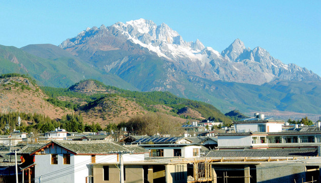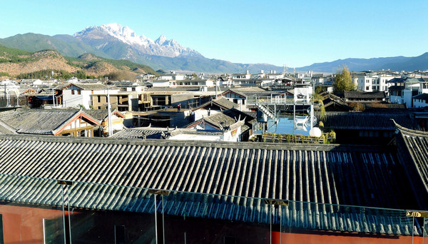 2018.12.21(D10),晨起独自登上客栈顶层眺望,脚下是一大片的灰瓦白墙房舍,沐浴在金色阳光下,远处可见白雪皑皑的玉龙雪山,风景确实甚佳。此地应该是位于“束河”镇的外沿,视野中全为新房,如其说是古镇,还不如说是“新村”。观罢去吃早餐,内容极其简单,大家都抱怨房间太冷,于是决定不再续住。