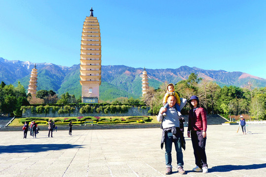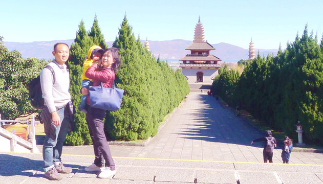 2018.12.25(D14),晨起后宝宝除偶尔咳嗽已无大碍,大家决定执行昨日议定的方案,今日先游崇圣寺,然后赴昆明。崇圣寺创建于云南早期的南诏国时期(唐),辉煌于随后的大理国时代(宋),先后曾有九位大理国皇帝到崇圣寺出家为僧。所以,历史上的崇圣寺曾经规模宏大、富丽堂皇。然而斗转星移,崇圣寺也经历了多次天灾、人祸,时间到了清朝末年,原本辉煌的寺院就只剩下三座佛塔,人称“崇圣寺有塔无寺”。上世纪末至本世纪初,崇圣寺又经历了大规模的重建,先是复原了三塔背后的“建极钟楼”,随后又在钟楼后面复建了“雨铜观音殿”,2003年更是启动了规模巨大的崇圣寺整体复建工程,在“雨铜观音殿”后面的古遗址上又重新出现了一大片的楼、台、殿、阁,整个仿古建筑群落占地约600亩,其中的建筑面积超过20000平方米。同时,还利用三塔前面的空地,建造起了崇圣寺的庙门与金翅鸟广场,2005年4月重建工程全部完工,“崇圣寺三塔文化旅游区”被打造成为国家AAAAA级景区。