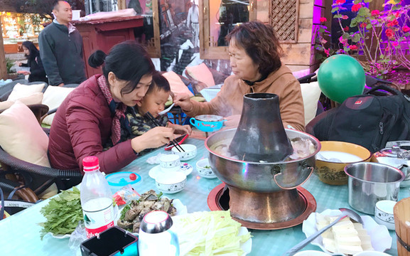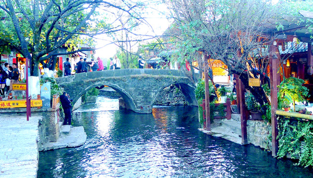 “大石桥”就在四方街附近不远处,由明代的木氏土司修建,距今已有五六百年。此桥为双孔,全石结构,因为是古城内最大的石拱桥,直接取名“大石桥”。1999年我曾在桥头附近看到两家小餐馆,并在其中的一家吃过纳西族早餐。现今这里依旧是有两家餐馆,但规模已经大为扩展,周边也热闹多了。我们选择在其中的一家吃晚饭,天冷、餐桌又是露天摆放,决定吃火锅,依旧是纳西风味。饭后天已全黑,直接返回“丽歌假日酒店”。