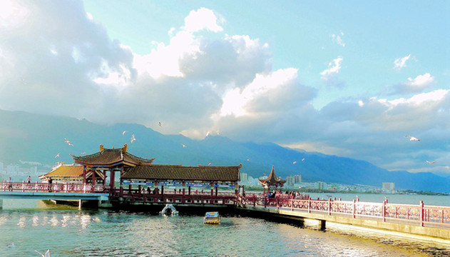 附近有处“海心亭”,它是洱海公园的核心景点,长长的栈桥从“滨海大道”路边一直延申入洱海,其远端是由栈桥链接几座亭、阁所构成的环型观景长廊。黄色琉璃瓦的亭阁搭配红色栏杆的长桥,远处是蓝天白云下的洱海、苍山,秀丽风光让宝妈着迷,连声赞叹大理比厦门更美。