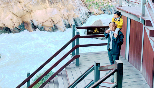 13:49重返停车场,包括上上下下,总计只在景区逗留约50分钟,不过,自驾游的精髓并非只在景点“打卡”,行车途中也是乐趣多多。虎跳峡海拔近2千米,钢架楼梯的垂直高差约70米,对于我这个时年78岁的“老驴”来说,上行要比下行吃力得多,中途需经多次停留、喘息。虎跳峡分为上虎跳、中虎跳、下虎跳三段,总长17公里,现时的景区仅为“上虎跳”中的一个小段,但它也是整条大峡谷的最狭窄部分,最窄之处仅有30米宽。