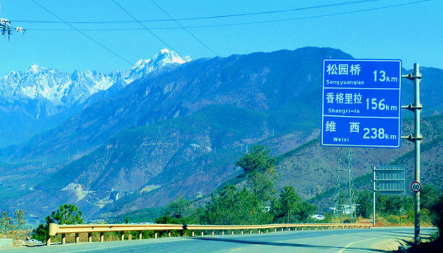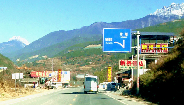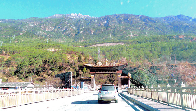 11:15出发前往虎跳峡,11:26在“丽江西”上G5611大丽高速,11:44在“白汉场”收费站下高速,转进国道G214,沿金沙江东岸向北行驶。11:56又见玉龙雪山,我们此刻是在雪山西侧(昨天是在雪山东侧)。12:00驶过“金沙江三股水”,12:12在“松原桥”桥头看到两座雪山,玉龙雪山距离较近,位于金沙江东岸,西岸远处还有另一座雪峰,叫做哈巴雪山,虎跳峡就是位于这两座雪山之间。
