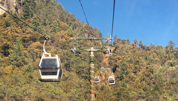 玉龙雪山有大、中、小三条登山索道,分别位于雪山的不同位置,其中:大索道称“冰川公园索道”,全长2914米,垂直高差1150米。游人搭乘索道可以从海拔3350米的“下站”直抵位于雪山主峰“扇子陡”正下方的索道上站(海拔4506米),然后再沿栈道徒步走到海拔4680米处(冰川公园开放旅游的最高点),近距离地接触山顶冰雪 ;中索道称“牦牛坪索道”,全长1200米,垂直高差360米,可以抵达海拔约3600米的牦牛坪 ;小索道称“云杉坪索道”,全长约1000米,上下高差300米,可以抵达海拔约3200米的云杉坪。“冰川公园索道”是玉龙雪山最具特色的旅游项目,但此刻却是无法成行,因为冬季风大索道停开。剩下的牦牛坪与云杉坪都是雪峰下的草坪:牦牛坪较远,面积约16平方公里,索道缆车是限乘2人的开放式吊篮;云杉坪位置较近,面积也较小,索道缆车为全封闭的8人吊厢。我们因为有宝宝随行,选择前往距离较近、索道也更为安全的云杉坪景区。