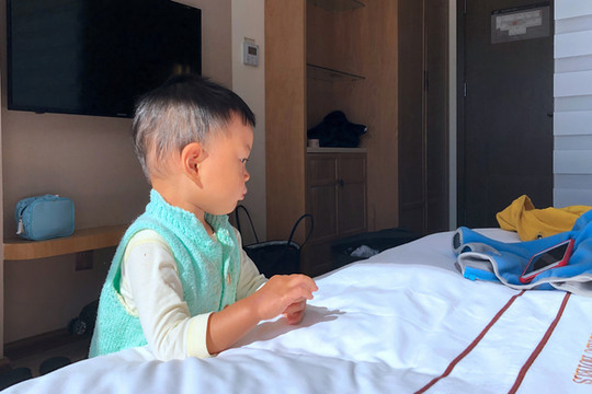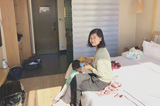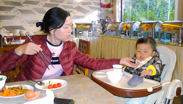 自打入住酒店直至今天中午,宝宝母子就没走出过客房,三餐都是宝爸到餐厅打饭带回房间。这家酒店客房的落地式的大玻璃门、窗很是给力,冬日阳光直射房内,暖和、舒适,特别适合让宝宝调养。宝宝不能外出,只好自找乐趣玩水消磨时光。