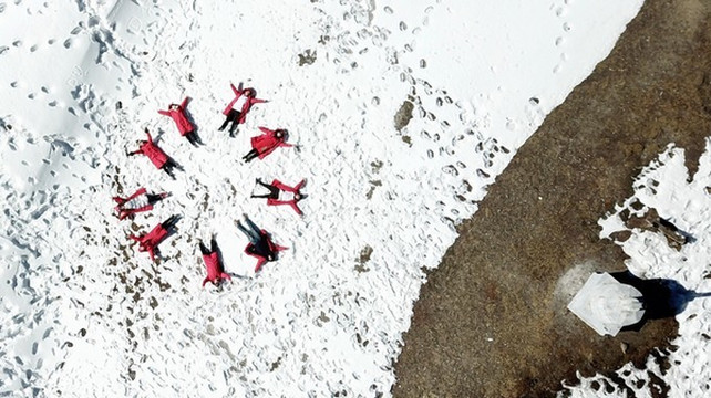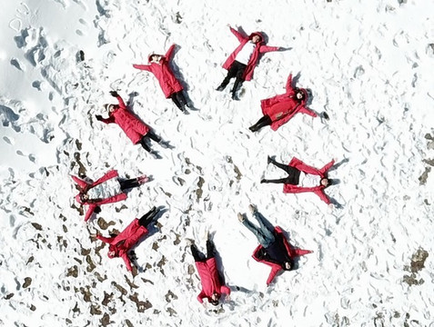 没有什么比在格宗雪山下吃烧烤更惬意的事儿了。这是我们躺在海拔最高处的雪地上拍摄航拍大片: