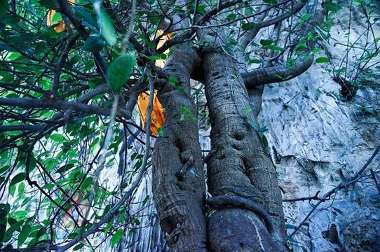 菩提树紧贴着崖壁生长,从远处看,树冠的整体形状就像一只凤凰,碧绿的尾巴在悬崖峭壁上张得大大的,所以这棵菩提树又叫“凤凰菩提”。