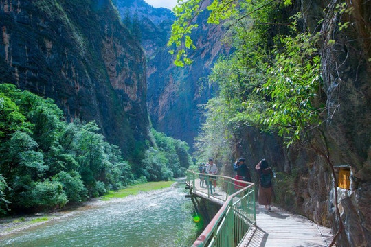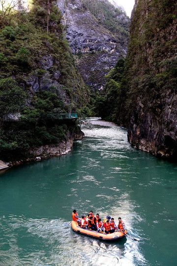 沿河边的栈道往里走2.5km,可以坐船漂流下来,或者是原路返回。漂流:120元/人