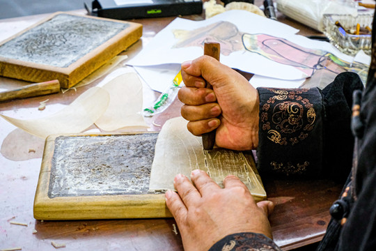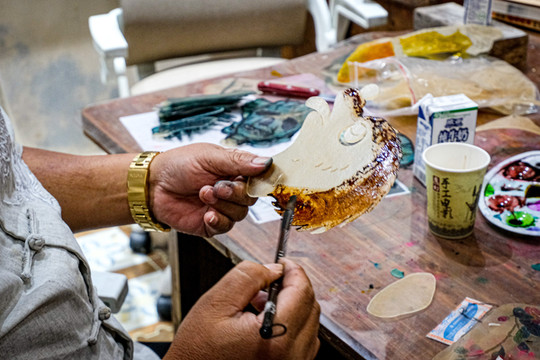着色的时候不能用水彩、国画颜料,一定要用矿物质颜料,这样色彩才能更持久、通透。