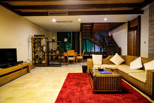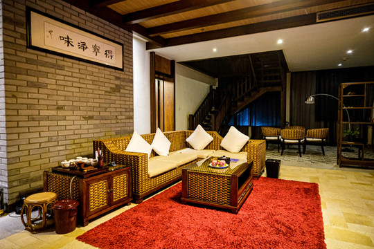 餐厅内部结构较为复杂,竹楼的上下两层被分为包间和过道餐桌。