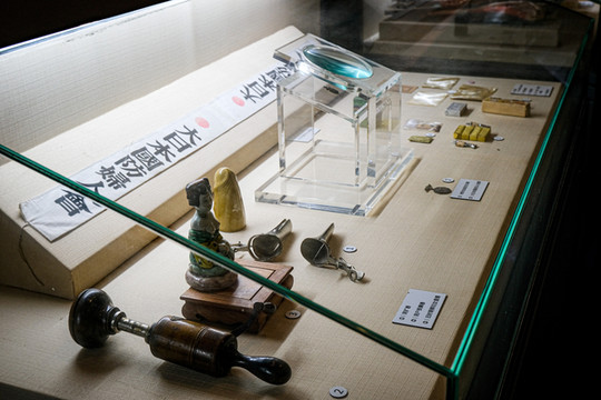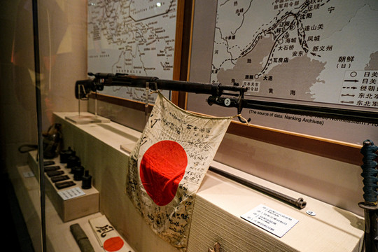 橱窗里陈列了八路军兵工厂制造的独厥手枪、八路军使用的地雷、新四军使用的手榴弹、八路军解放区的农民身份识别布标、还有纪念叶挺、王若飞将军飞机失事纪念章等物件。还有日军九四式军刀、日军三八式步枪等,并有“忠勇”字样的小刀,日军地下足袋,日军九零式铁帽等。