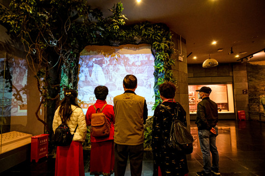 走进滇西抗战纪念馆,一种强烈的震撼力扑面而来,一幅幅抗战历史的画面浮现在脑海里。首先映入眼帘的是一面三人巨型浮雕墙,中间站的是中国远征军,左边为盟军,右边为滇西抗日民众,分别代表了3股抗战力量。他们坚挺身躯,目视远方,透出一种视死如归的坚定。这面墙表达的内容就是滇缅抗战的真实写照。