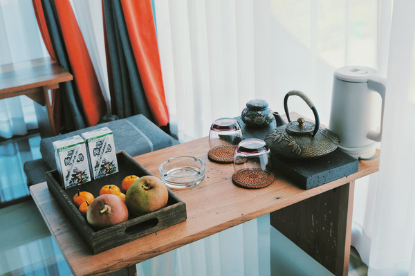 在床边还有个小茶几,放着一些水果和牛奶还有滇红茶。(水果和牛奶可以无限免费续)