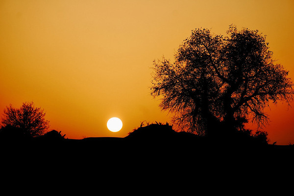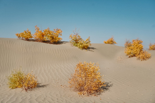在塔克拉玛干沙漠里,胡杨和沙漠相互守候着,,金秋十月的胡杨,褪去了青涩,展现着金黄的色彩。金黄的胡杨点缀其间,加上沙漠起伏的沙丘线条,不管什么时候看都是一幅美丽的风景画。