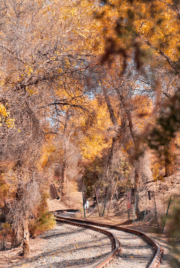 沿着环形游览小铁路往胡杨深处走,你会发现,在湛蓝天空下的胡杨,在阳光的照射下,金黄的颜色更加夺目,满是岁月痕迹的金黄胡杨和小铁路,共同组成一幅五彩斑斓的油画。走在满是金黄的小铁路旁,满目都是美。