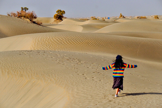 随着车子越往前,就感觉进入到沙漠深处,环顾四周都是茫茫沙漠。我们找到一个可以停车的观景点,忍不住走进沙漠里,行走在沙漠中,在绵延沙丘上留下一排排脚印。头顶是无尽的蓝天,远处的胡杨在抖动着金黄的叶子,满目都是秋日的色彩。在这看不到尽头的沙漠里,感受到大自然的神奇,自己的渺小以及放松的自由。
